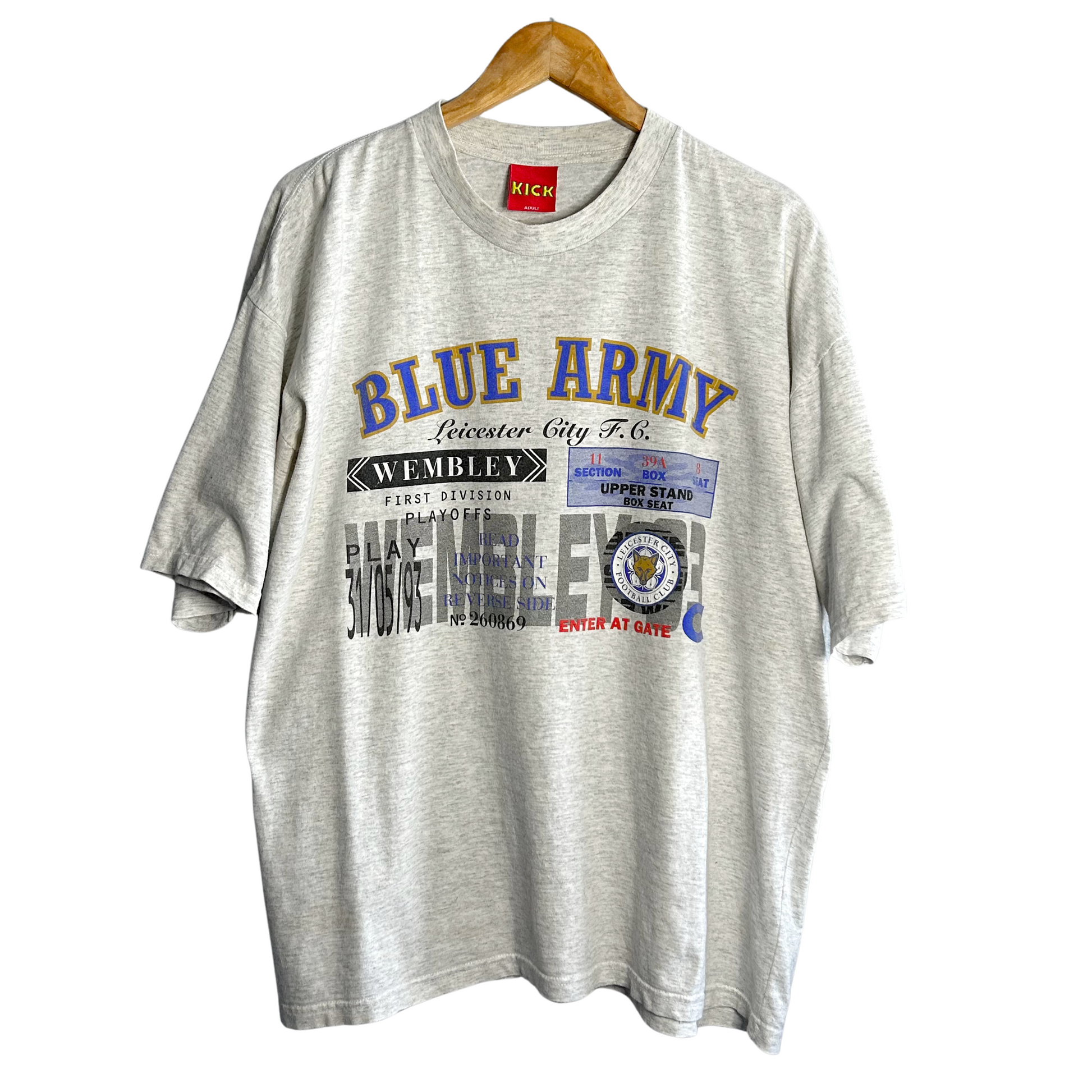 Graphic t-shirt, designed and produced by the cult 90’s firm KICK. Commemorates the Foxes’ trip to Wembley in 1993 for the First Division play-off final.