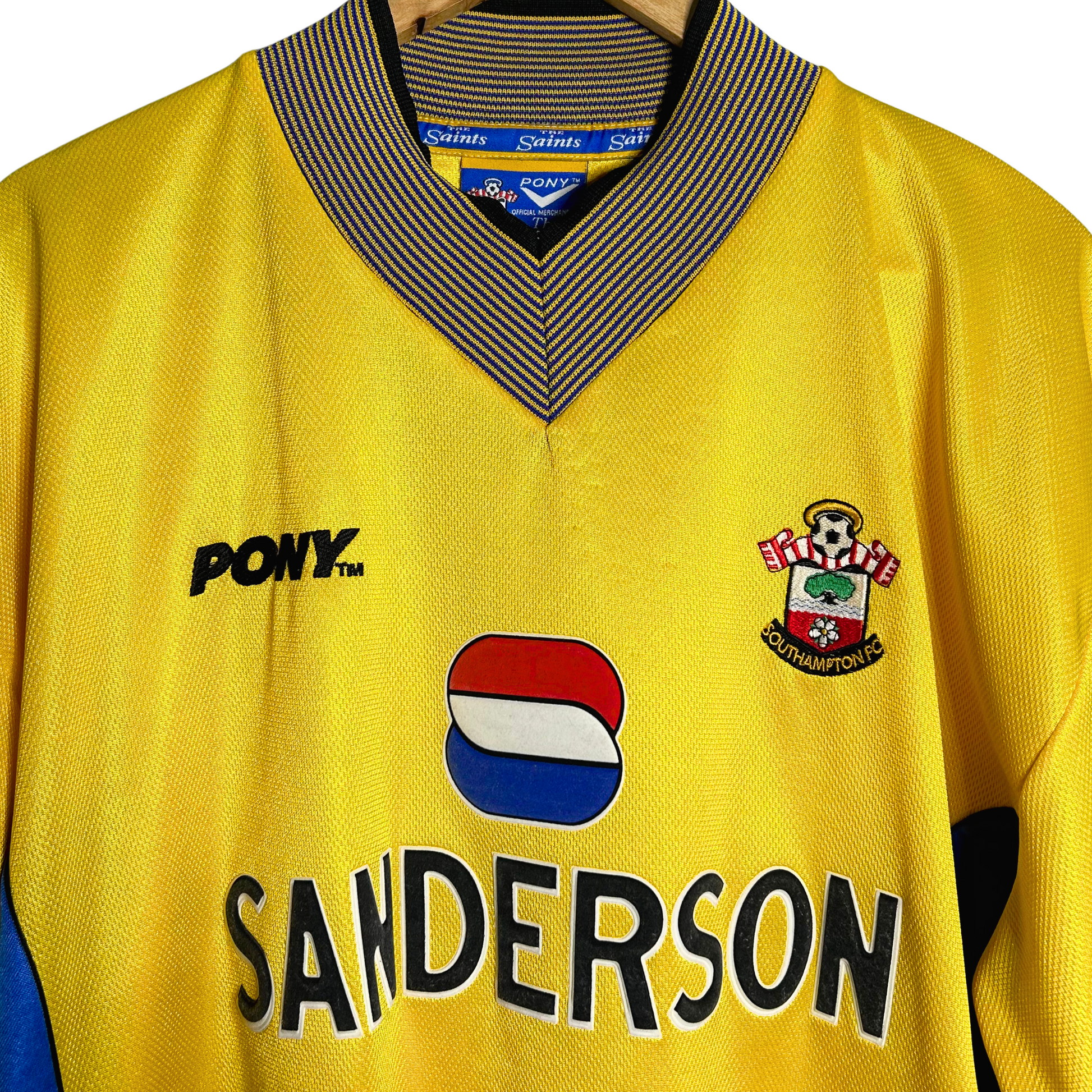 Absolutely stunning Pony shirt, as worn by Southampton as they narrowly avoided relegation to the second tier in 1999. Features classic Sanderson sponsor and brilliant throwback collar.