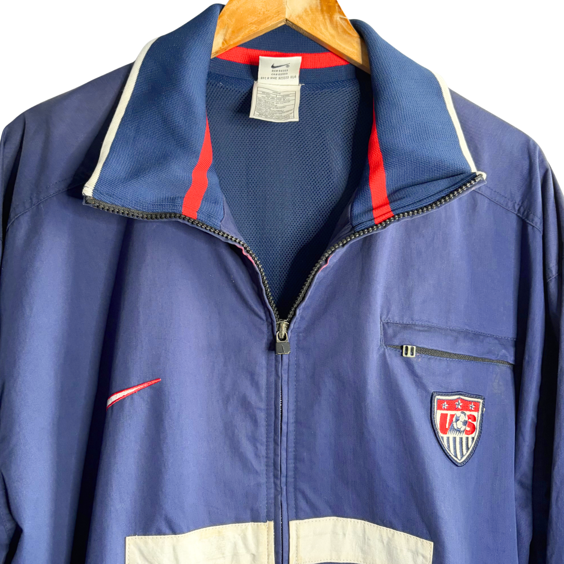Vintage Nike jacket, produced for the USMNT in the late 1990’s. The jacket is rather baggy and certainly more heavy-duty than a usual tracksuit and features an extra pocket to the upper chest. This particular jacket also features a stitched white bar across the central chest, which other versions of this jacket do not have.