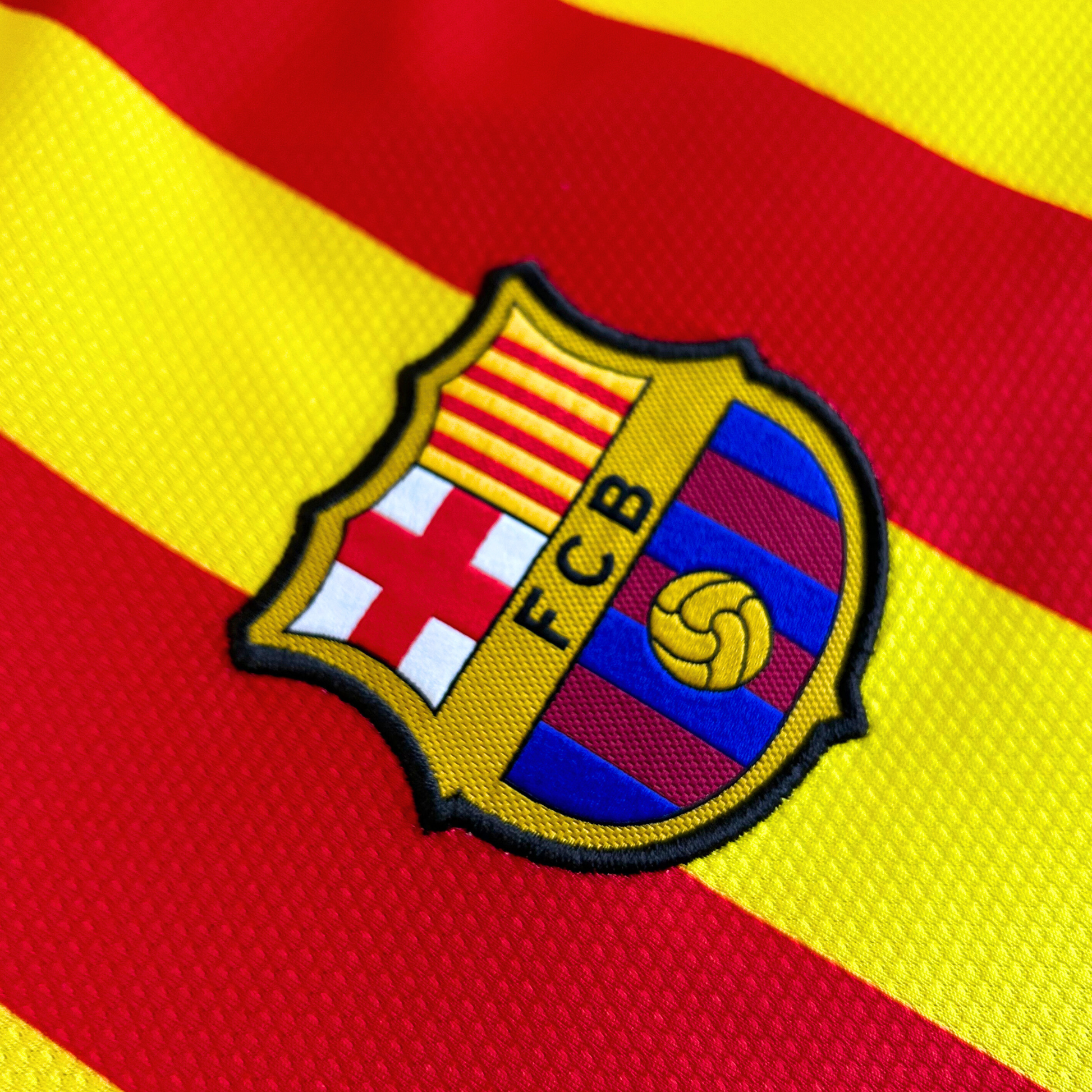 Beautiful away shirt by Nike, inspired by the flag of Catalunya. Features club print for Lionel Messi. Messi scored an unbelievable 41 goals in 30 appearances in the 2013-14 season.