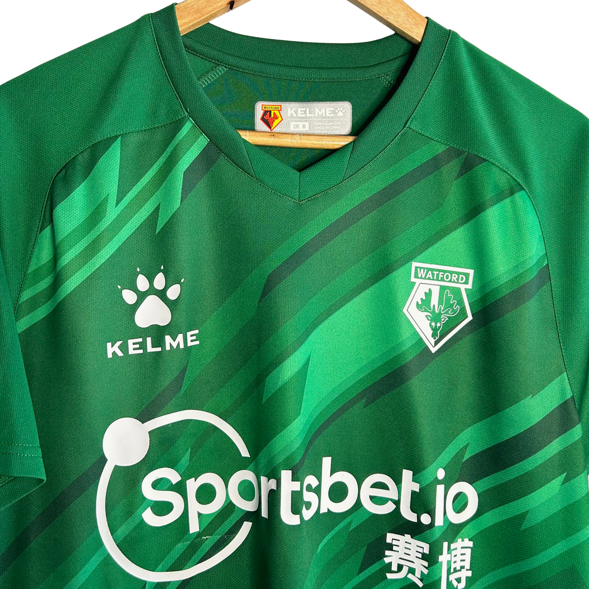 Green Kelme goalkeeper shirt, as worn by Watford as they won promotion to the Premier League. Features EFL patches and print for England international, podcaster and social media star Ben Foster.